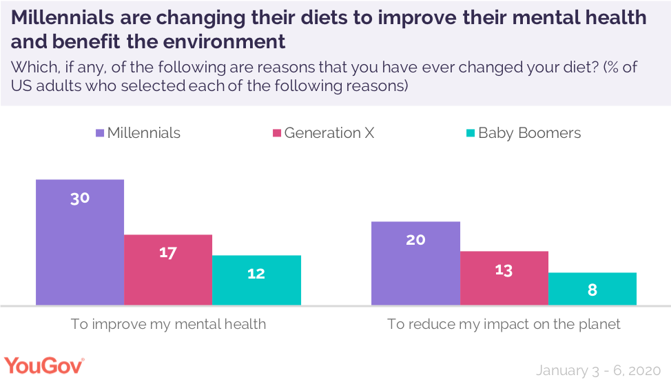 New data from YouGov finds that Millennials are more likely than other generations to say that they have changed their diet in order to improve their mental health (30%) or reduce their impact on the planet (20%).
