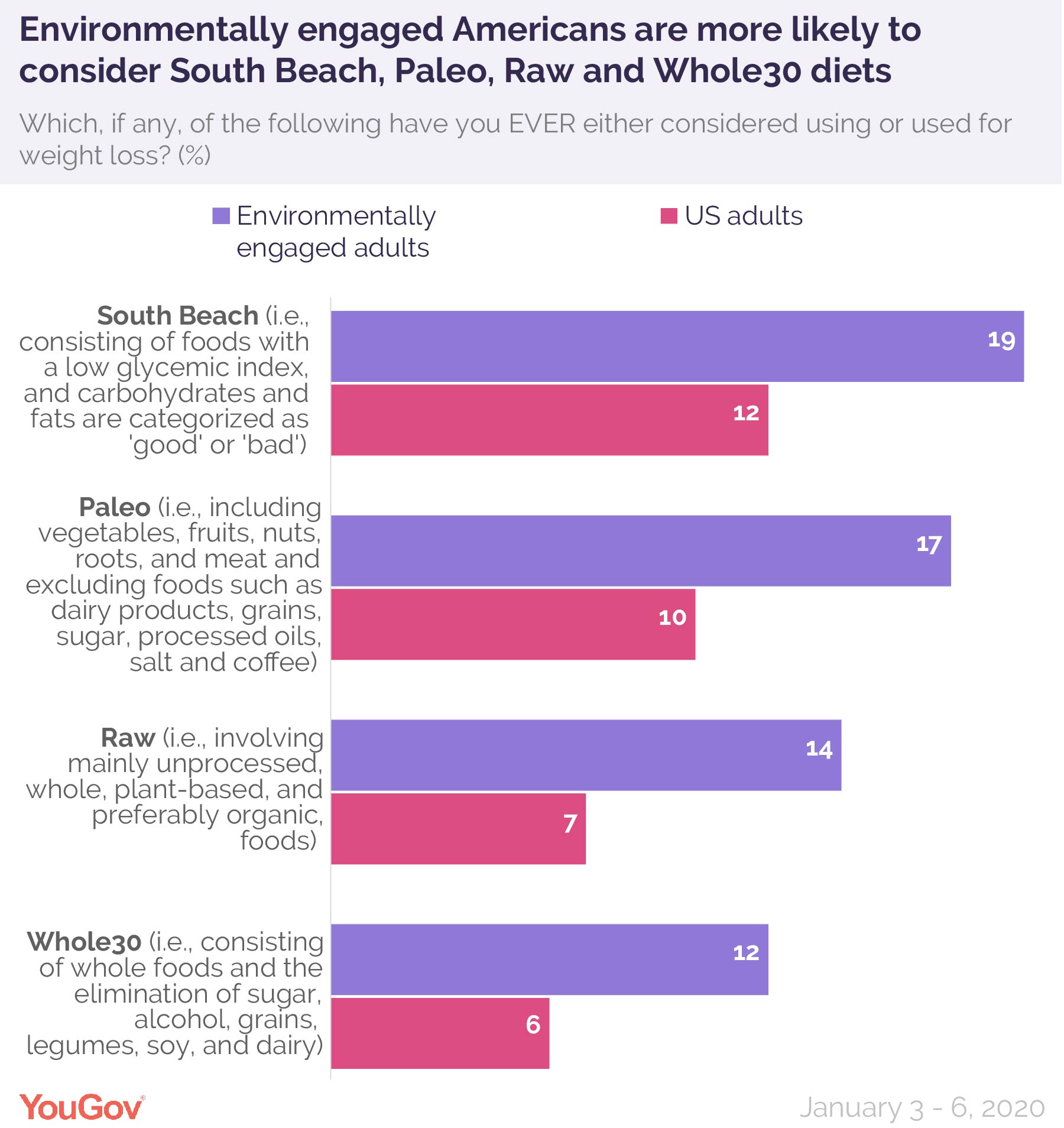 According to YouGov’s sustainability segmentation, a measure of where consumers land on the spectrum of beliefs around sustainability, the country’s most engaged environmentalists are more likely to consider a raw diet (i.e. unprocessed, plant-based, organic) compared to the rest of US adults. This segment is also more likely to consider the South Beach, Whole30 and Paleo diets. YouGov’s sustainability segments are based on a dataset that spans five attitudes about sustainability, from skeptic to enthusiast.